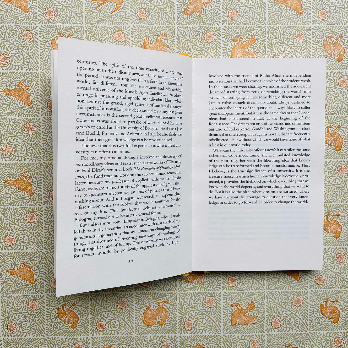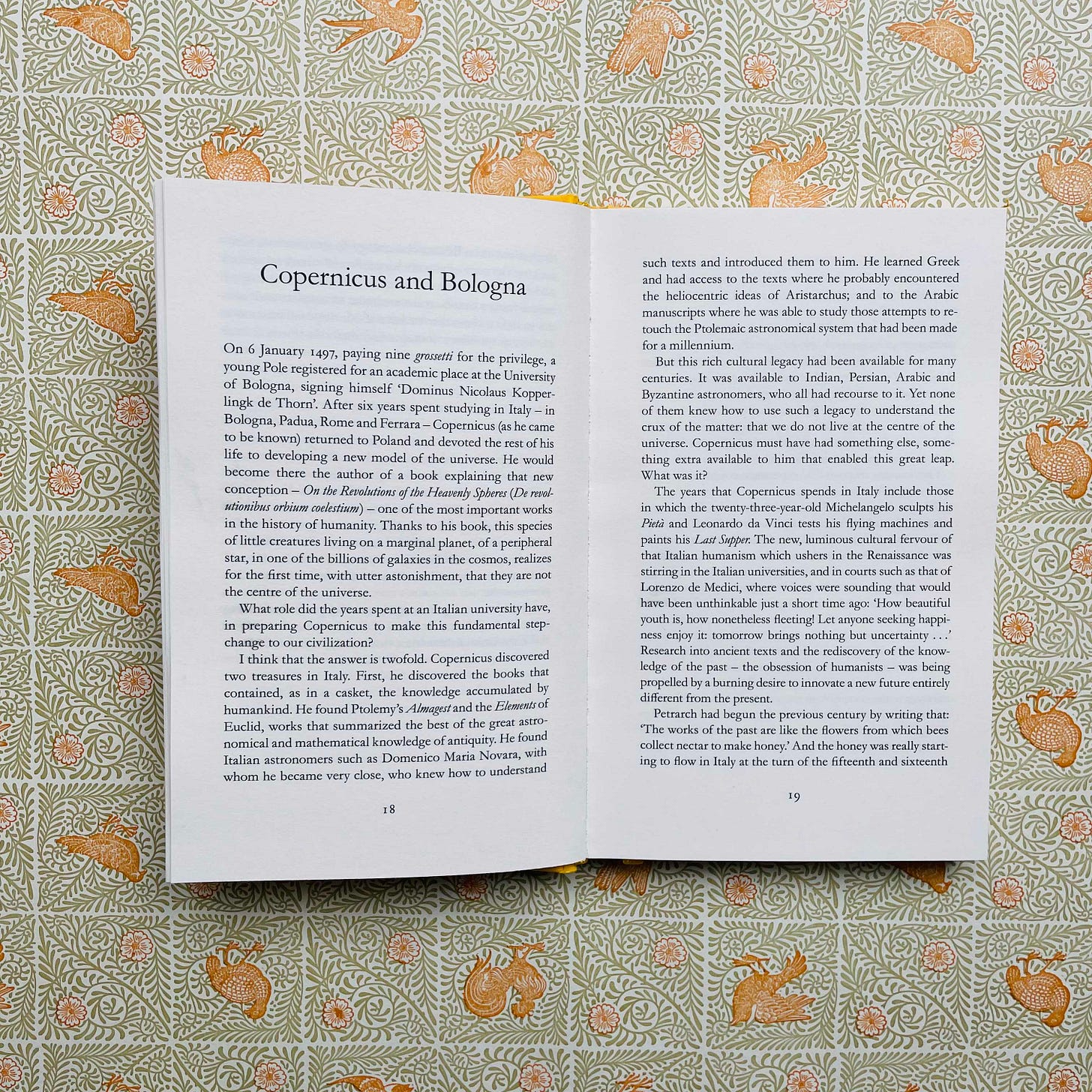 As a physicists Rovelli often speaks about science and poetry and how they belong together. But my favorite essay in this collection was "Copernicus and Bologna" on the role of higher education. In it Rovelli attributes Copernicus’ scientific breakthrough to the time he spent in Bologna surrounded by old knowledge, but propelled by the spirit of innovation from a community of young people like Da Vinci and Michelangelo.